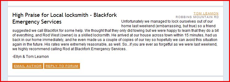High Praise for Local locksmith - Blackfork Emergency Services Tom Leamon Robbins Mountain Rd