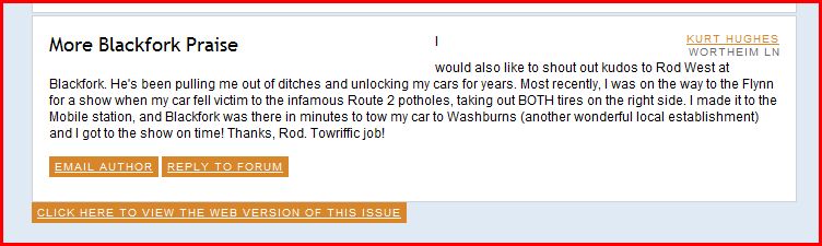 I would also like to shout out kudos to Rod West at Blackfork. He's been pulling me out of ditches and unlocking my cars for years. Most recently, I was on the way to the Flynn for a show when my car fell victim to the infamous Route 2 potholes, taking out BOTH tires on the right side. I made it to the Mobile station, and Blackfork was there in minutes to tow my car to Washburns (another wonderful local establishment)and I got to the show on time! Thanks, Rod. Towriffic job!